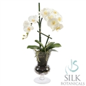 Autumn bouquet in glass vase. 11 inches tall, very full with faux fall blossoms- mini gerbera daisies, ranunculus blooms, wax flower spray clippings mixed in with autumn shaded poplar leaves. Set in river rock pebbles with Liquid Illusion fake water for additional realism.