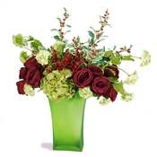 Mixed Rose & Holly Centerpiece Green Ball Vase 11 Inch