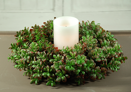 Succulent wreath trio- set of 3 wreaths 14 in. diameter each. Arrange them horizontally, vertically...put them individually in different parts of your house...here's your chance to get creative! Or here's another idea...use them as candle rings- shown here with a flameless battery candle (not included).