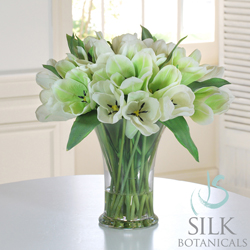 Tulips overflowing in abundance, with blossoms in both white and chartreuse shades. Liquid Illusion faux water adds more realism. Cylinder shaped glass vase, 19" tall, 19" in diameter.