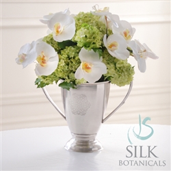 Orchids and snowballs are mingled together playfully in a classic metal loving cup urn. Standing 15" tall, the orchids are in white and the snowball blossoms are a soothing lime green.