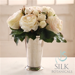 The metal julep cup is a classic floral design container, and for this design, we"ve filled it almost overflowing with creamy white rose blossoms and buds in various sizes along with rose foliage. 15" tall.