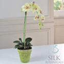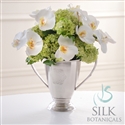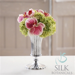 Phalaenopsis orchids are grouped artistically with lime green viburnum in this classic silver ceramic vase. 10" tall.