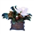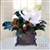 Magnolia blossoms and foliage are arranged in a class brown rectangular vase. The blossoms are white, and of course the foliage is typical deep magnolia green. 16 in. wide and 16 in. tall.