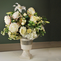 Mixed floral centerpiece in whites, creams and greens is presented in this classic vermeil ceramic vase. 31 inches tall, 28 inches in diameter. Flowers used include peonies, roses, viburnum, hydrangea and more.