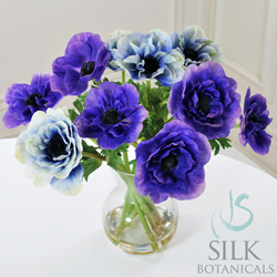 Poppy anemones in fresh blues and purples- always fun, always festive, purely poppy...anemones!  In a glass vase with H2Faux liquid illusion. 14" tall, a great accent item.
