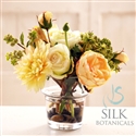 Rose buds in soft pink shades clustered together and placed with care into a clean and classic square glass vase. 9 inches tall. Liquid Illusion fake water adds even more realism. Also available in white and in green