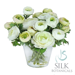 Ranunculus blossoms in soft greens and shades of white & cream are looking fresh as ever (forever!) with Liquid Illusion faux water adding even more realism to the mix. 10 inches tall.