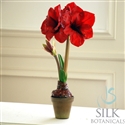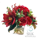 Red roses and hydrangea are the focus of this beautiful holiday arrangements. Red ilex berries and holly sprigs add accents of color. In a glass vase with Liquid Illusion faux water to add even more realism. 14" tall, 10" wide and deep.