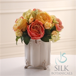 Classic floral design excellence if we do say so ourselves! Roses in various sizes and shades of yellow, peach and orange have found a home in this classic ceramic canister container. 14" tall.