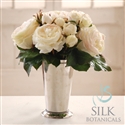 Roses and peony blossoms are teamed up with lime green snowball (viburnum) in this simple yet elegant square glass vase. Liquid illusion and river rock petals make sure everything stays "put" in the vase. 10" tall. White roses and peonies.