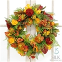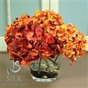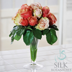 Rose buds, large and small, in shades of peach complete with foliage, are placed into a trumpet shape glass vase. Standing 14" tall and 10" in diameter, this design also includes Liquid Illusion faux water.