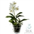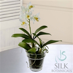 Dendrobium orchid- Potted in a glass vase with faux soil showing, 15" tall in white color.
