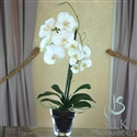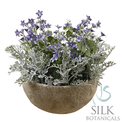 Summer floral planter with wild violets and dusty miller in a ceramic bowl 12 inches high, 14 inches in diameter.