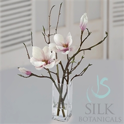 Tulip magnolia branches in a square glass vase in a soft orchid blush color- perfectly natural looking with Liquid Illusion adding realism with a fake water effect. 18" tall, 5" in width and depth.