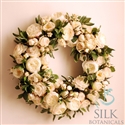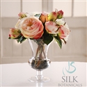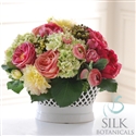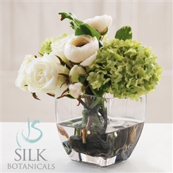 Roses and peony blossoms are teamed up with lime green snowball (viburnum) in this simple yet elegant square glass vase. Liquid illusion and river rock petals make sure everything stays "put" in the vase. 10" tall. White roses and peonies.